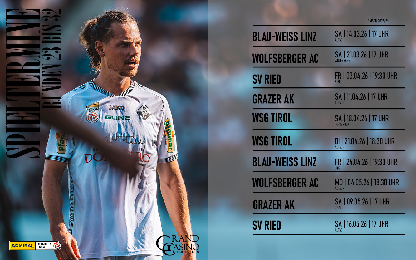 Nur wenige Stunden nach dem letzten Spiel im Grunddurchgang der ADMIRAL Bundesliga steht bereits der weitere Spielplan bis Sommer fest. Für die Rheindörfler starten und enden die PlayOffs je mit einem Heimspiel. Los geht es bereits kommenden Samstag gegen den FC Blau Weiß Linz. Die Spieltermine gibt es unten in der Übersicht. Ticketinfos folgen bereits morgen.