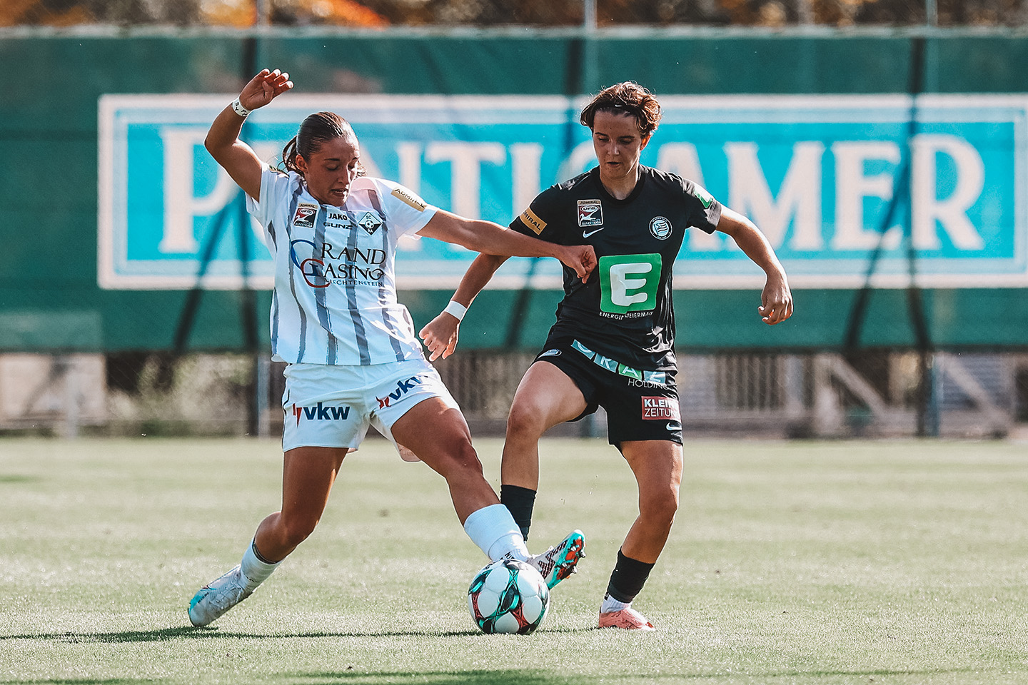 Der SCR Altach startete hervorragend in die Begegnung, presste hoch und ließ den Grazerinnen nur wenig Räume zu. Sie waren von Beginn an das aktivere Team und belohnten sich schließlich in der 17. Spielminute: Nach einer starken Aktion der jungen Schweizerin Nayana Ebersold vollendete sie aus spitzem Winkel ins kurze Eck und sorgte für die verdiente 0:1 Führung für die Gäste.