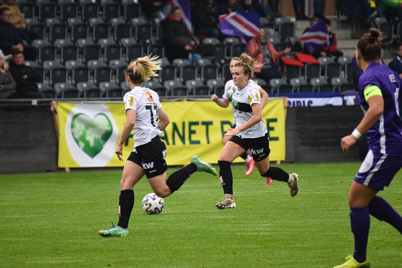 Bei frischem Oktoberwetter brauchten die Gäste aus Wien keine Anlaufzeit, denn bereits nach 110 Sekunde fiel der Führungstreffer für die Austria. Einen missglückten Abschlag von SCR / FFC Keeperin Koretic fingen die Wienerinnen ab, spielten direkt in die Spitze auf Wucher und jene war mit ihrem Abschluss in die lange Ecke erfolgreich. Die Spielgemeinschaft schüttelte sich kurz und kam in der 9. Minute durch einen Freistoß von Viki Pinther zum ersten gefährlichen Torschuss. Torfrau Haidner konnte allerdings parieren. Bei der nächsten Aktion konnte die Schlussfrau der Gäste allerdings nicht mehr retten: Rieke Tietz wandelte einen Konter in einen Sololauf um und schloss aus 25 Metern Entfernung ab. Der Ball schlug über Haidner ein. Ein tolles Tor zum 1:1 (14.). In der Folge verlagerte sich das Spielgeschehen mehr ins Mittelfeld, viele Zweikämpfe prägten diese Phase der Partie.