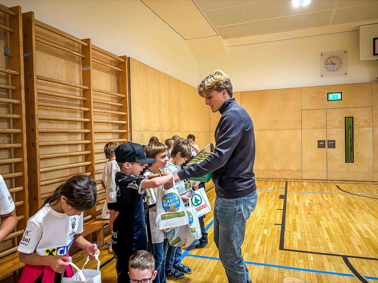 Zusätzlich hatten Paul Koller und Co. natürlich wieder einiges mitgebracht. Neben Autogrammkarten gab’s für alle Schüler*innen Tickets für unser kommendes Heimspiel gegen den SK Sturm Graz sowie coole T-Shirts zur Verfügung gestellt von Waibel Workwear und Raiba Club Vorarlberg.
