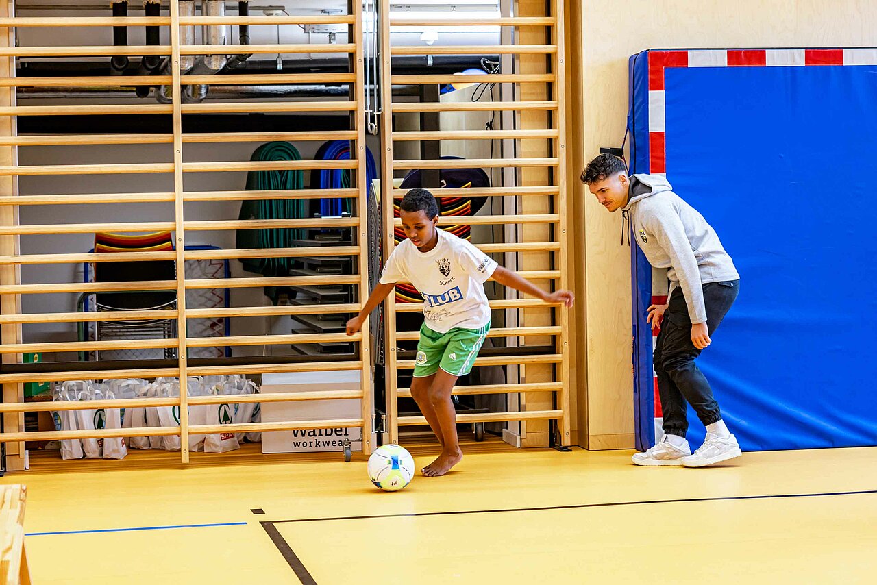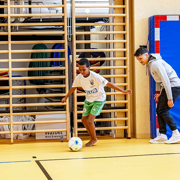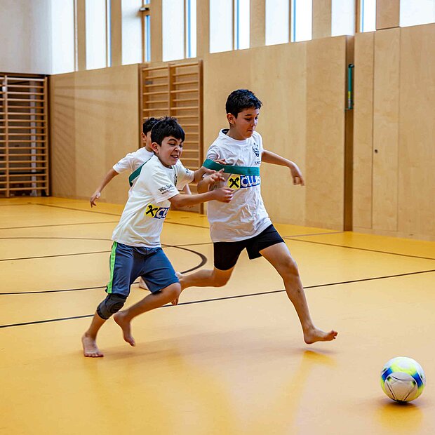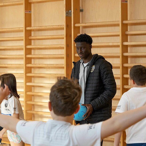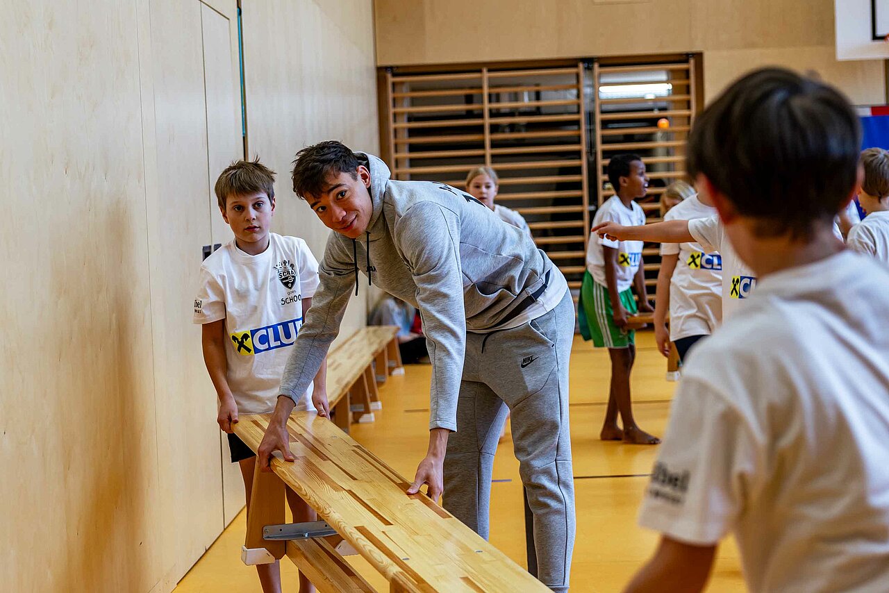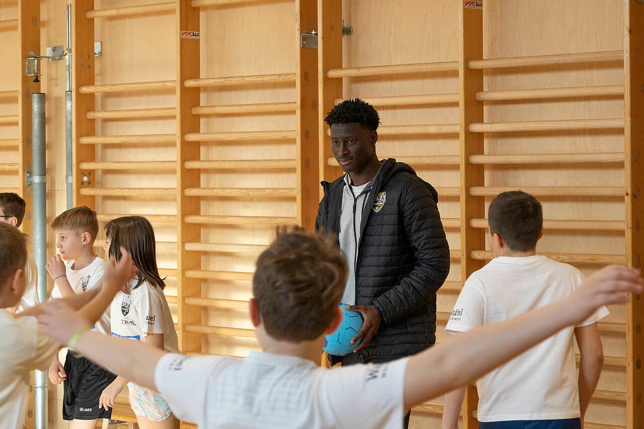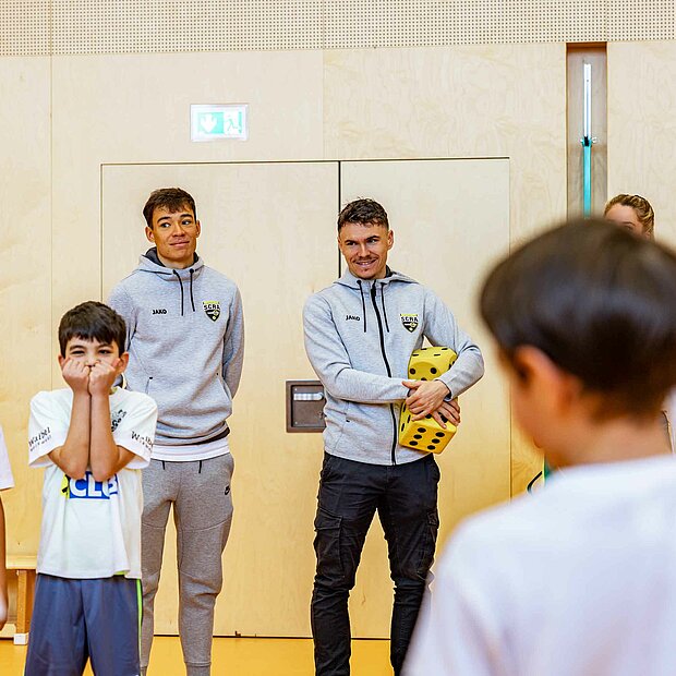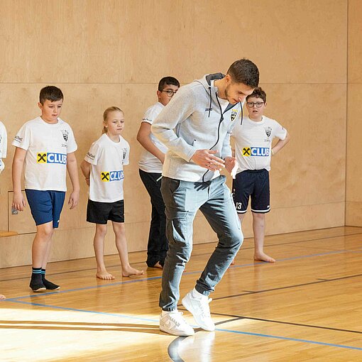 Einmal aufwärmen wie die Profis: In der Volksschule Röthis zeigte Rechtsverteidiger Sandro Ingolitsch der dritten und vierten Klasse, wie eine ideale Vorbereitung auf eine sportliche Betätigung aussieht. Im Lauf-ABC geht es weniger um das Alphabet – verschiedenste Übungen stellen sicher, dass alle Muskeln warm und einsatzbereit sind. Im Anschluss wurde nicht nur im Vorderland gekickt, sondern auch am Bodensee. In der VS Höchst Kirchdorf teilte Dominik Reiter dabei die Schüler*innen beim Würfelfußball ein: Jedes musste dabei mit jener Anzahl von Spielern agieren, wie gewürfelt worden war. Nach der anstrengenden Einheit konnte sich mittels gesunder Jause von SPAR wieder gestärkt werden: neben Obst und Wasser erfreuten sich die Kinder auch über einen Fruchtsaft von Pfanner.