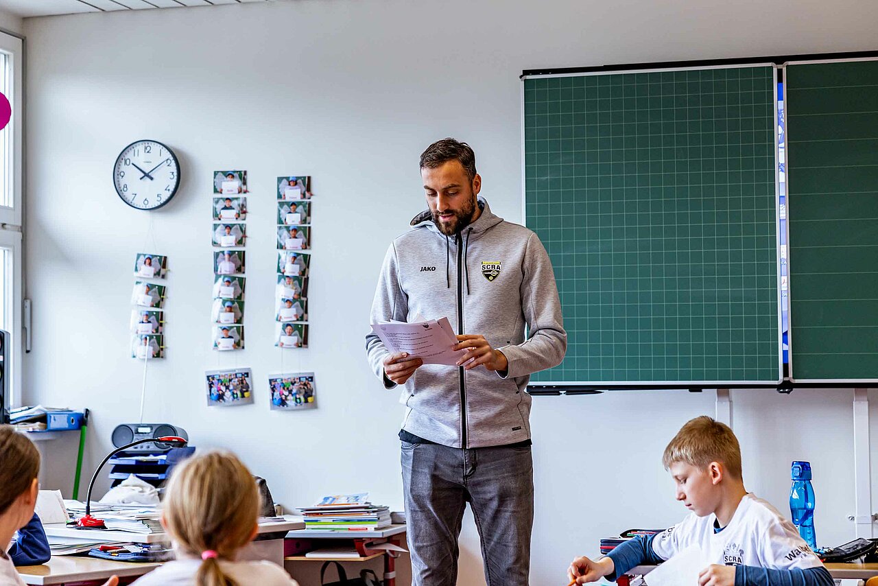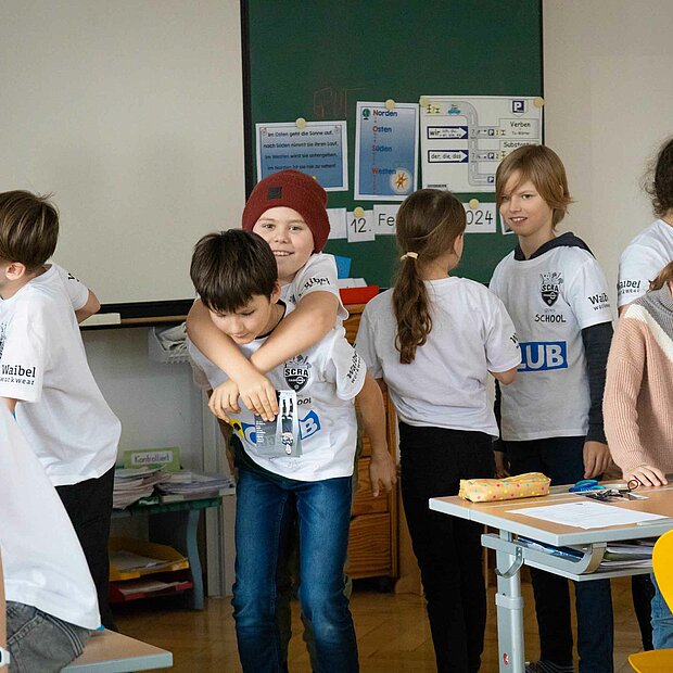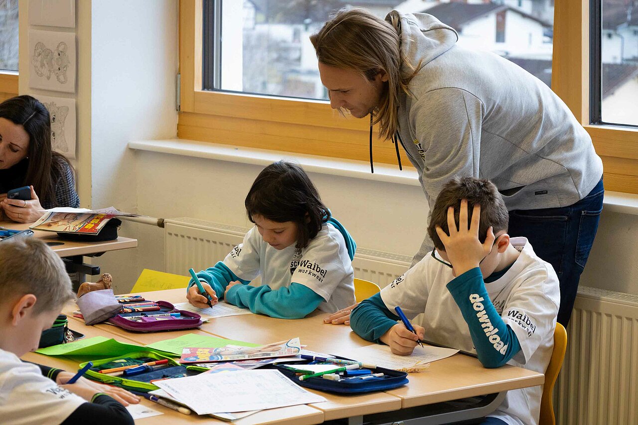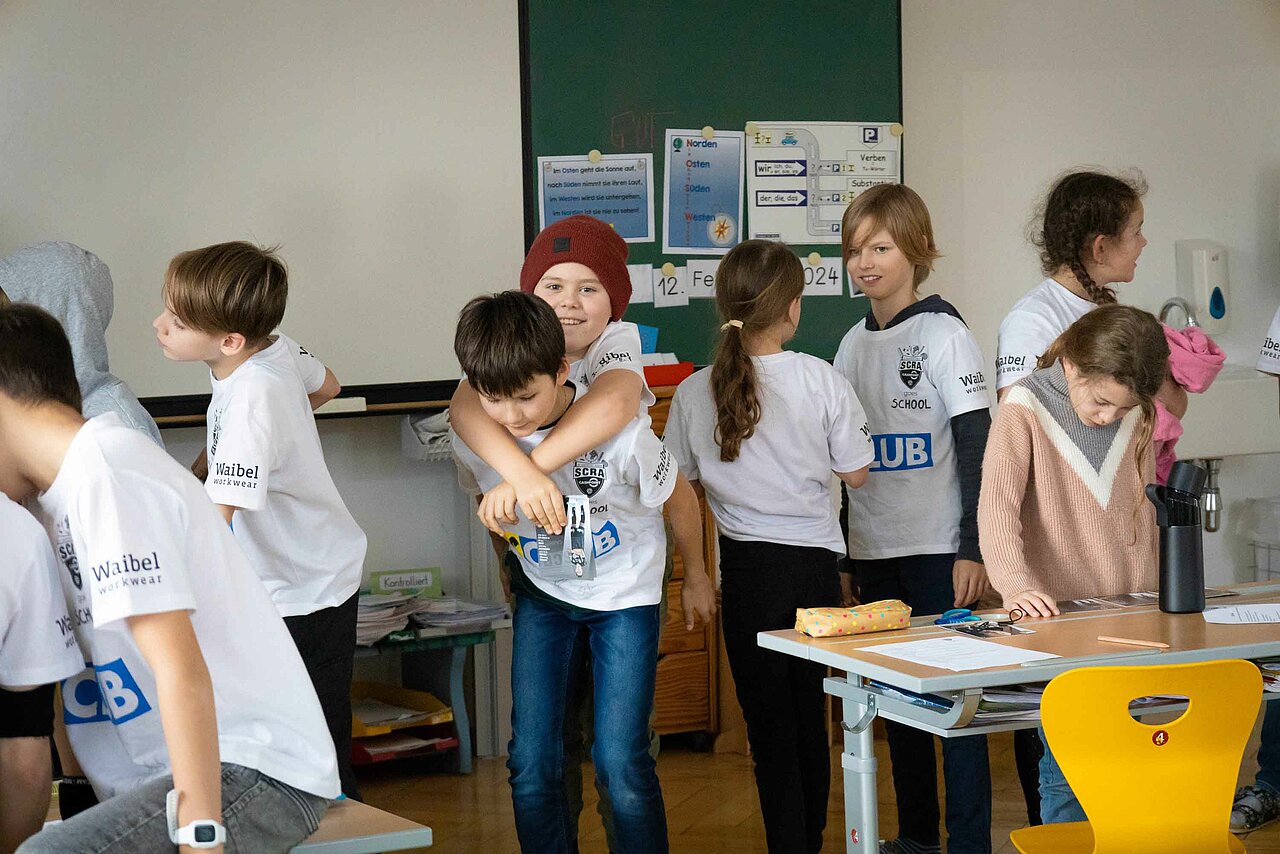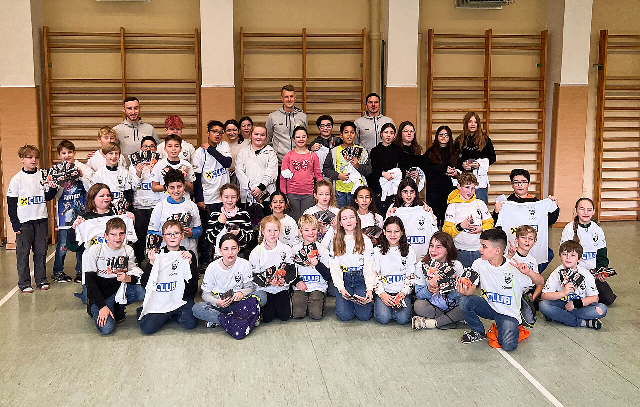 Ortswechsel: Vom Turnsaal ging es darauf hoch in die Klassen, wo die Kinder das SCRA-Quiz zu bewältigen hatten. Tobias Schützenauer half dabei den Götzner Schüler*innen gerne, alles wollte der Torhüter aber dann auch nicht verraten. Spielerisch wurde den Kindern vermittelt, wie wichtig Bewegung und gesundes Essen für ein vitales Leben sind. Nachdem der SCR Altach die Fragen durch das Quiz an die Schüler gestellt hatte, gab es einen Rollentausch. Die Kinder, welche ebenso mit einem Waibel Workwear x Raiba CLUB T-Shirt ausgestattet wurden, konnten dabei die Profis alles fragen, was ihnen auf der Leber gelegen ist. Warum Felix Strauss aktuell so lange Haare trägt, wollte ein junger Altach-Fan in Röthis wissen. In Egg waren Frisuren kein Thema, viel mehr freuten sich die Bregenzerwälder Kinder über die Einladung zum Heimspiel gegen Hartberg. Kapitän Lukas Jäger verteilte die Tickets, der Abschluss einer weiteren gelungenen SCRA Schultour.
