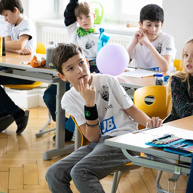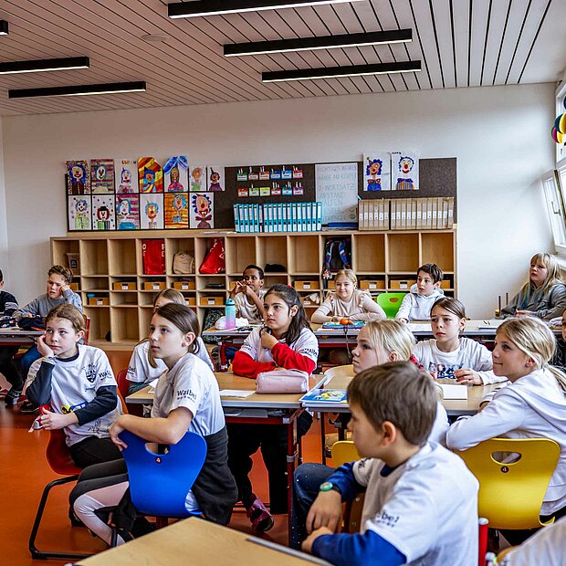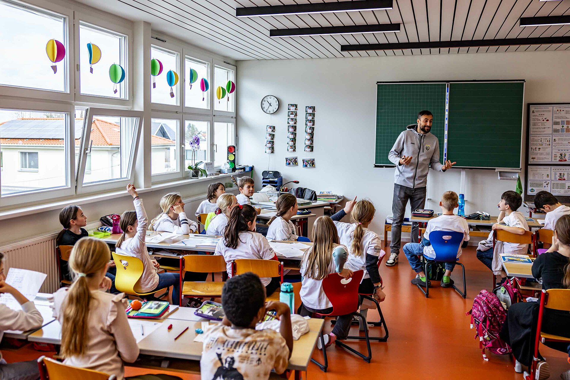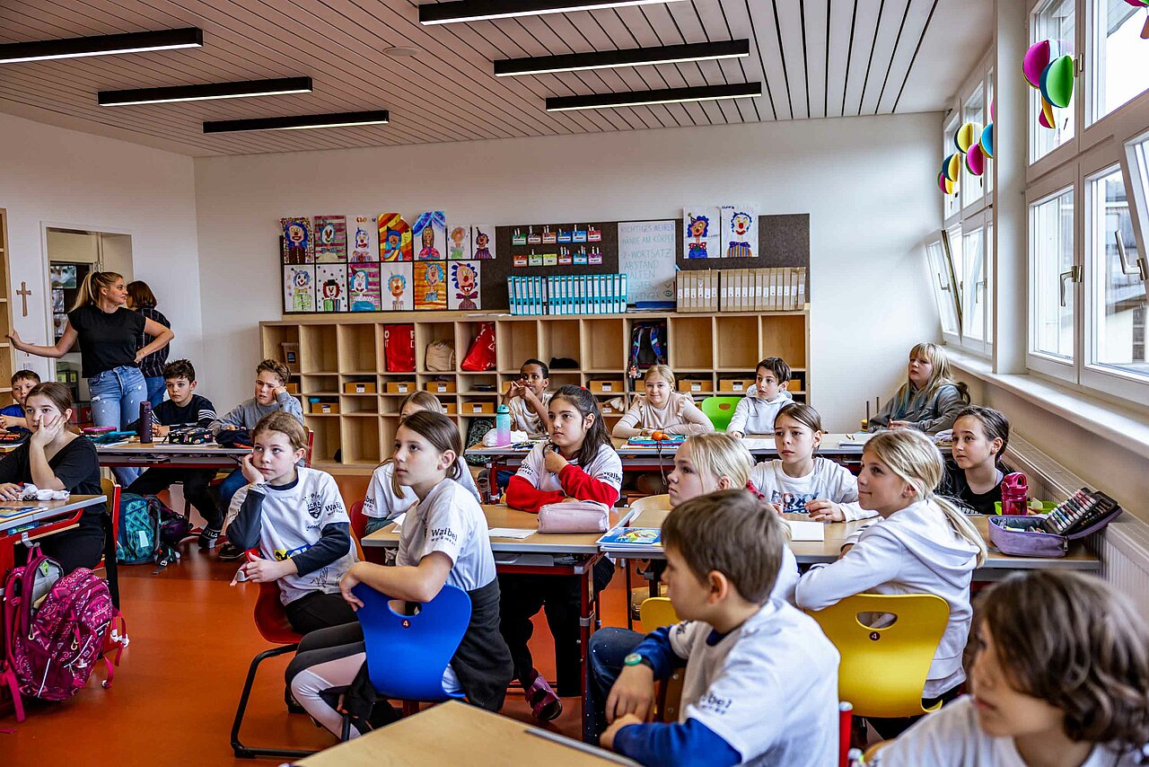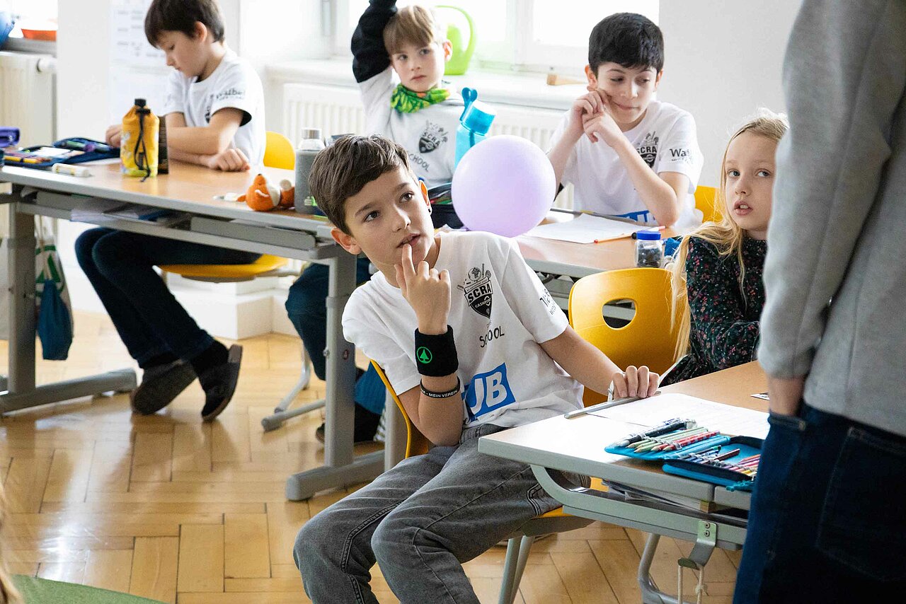 Ortswechsel: Vom Turnsaal ging es darauf hoch in die Klassen, wo die Kinder das SCRA-Quiz zu bewältigen hatten. Tobias Schützenauer half dabei den Götzner Schüler*innen gerne, alles wollte der Torhüter aber dann auch nicht verraten. Spielerisch wurde den Kindern vermittelt, wie wichtig Bewegung und gesundes Essen für ein vitales Leben sind. Nachdem der SCR Altach die Fragen durch das Quiz an die Schüler gestellt hatte, gab es einen Rollentausch. Die Kinder, welche ebenso mit einem Waibel Workwear x Raiba CLUB T-Shirt ausgestattet wurden, konnten dabei die Profis alles fragen, was ihnen auf der Leber gelegen ist. Warum Felix Strauss aktuell so lange Haare trägt, wollte ein junger Altach-Fan in Röthis wissen. In Egg waren Frisuren kein Thema, viel mehr freuten sich die Bregenzerwälder Kinder über die Einladung zum Heimspiel gegen Hartberg. Kapitän Lukas Jäger verteilte die Tickets, der Abschluss einer weiteren gelungenen SCRA Schultour.