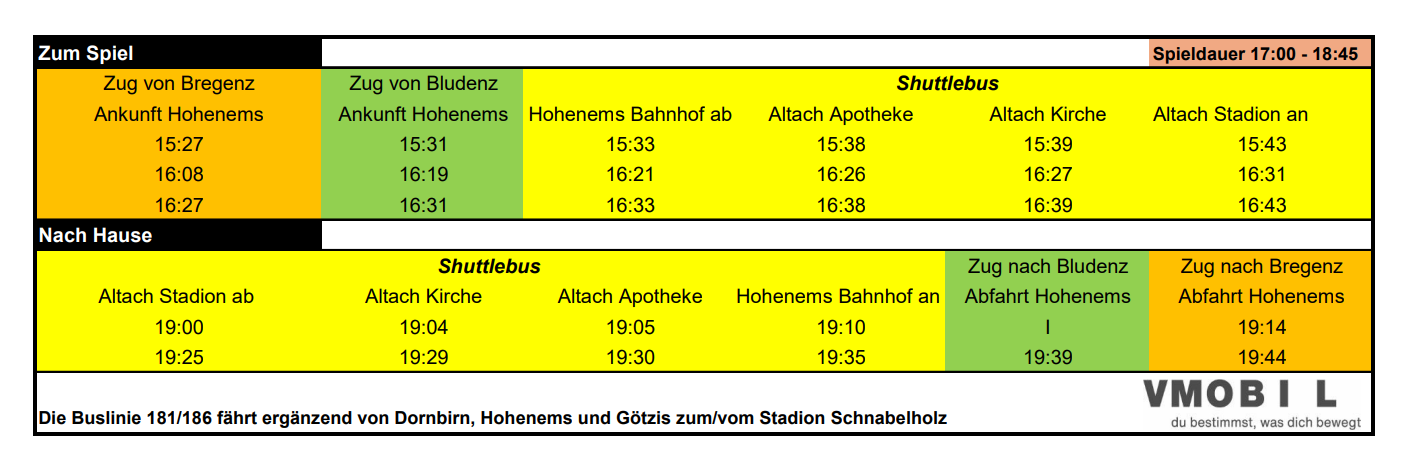 Der Bahnhof Altach können aufgrund einer Baustelle derzeit nicht alle Züge halten. Entsprechend wird der Shuttle-Bus zum Stadion in dieser Woche auch nicht am Bahnhof Altach halten, sondern ab dem Bahnhof Hohenems verkehren. Zugreisenden wird empfohlen, sich vorab über die ÖBB zu informieren.